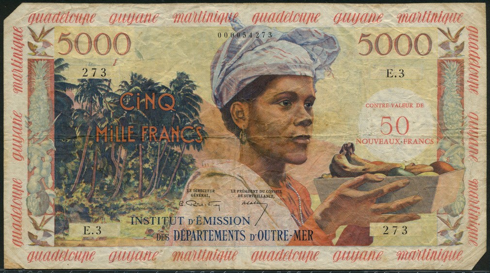 Caisse Centrale de la France d'Outre-Mer, French Antilles, 50NF on 5000 francs, 'Antillaise', ND (1960), serial number E.3 273, blue and multicoloured, woman at right with basket of fruit, trees at left, Postel-Vinay and Calvet signatures, MARTINIQUE/GUADELOUPE/GUYANE in red in borders around, red 'CONTRE-VALEUR DE 50 NOUVEAUX FRANCS' overprint in right field, reverse multicoloured, cane cutting scene