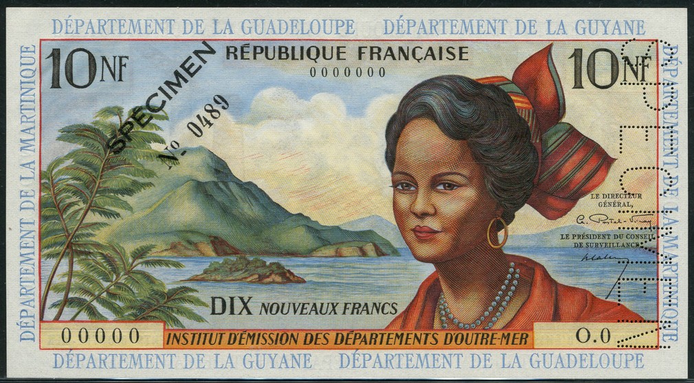 Institut d'Emission des Departements d'Outre-Mer, French Antilles, specimen 10NF (nouveaux francs), 'Antillaise', ND (1962), zero serial numbers, red and multicoloured, woman at right, mountain at left, Postel-Vinay and Calvet signatures, blue DEPARTEMENT DE LA MARTINIQUE/GUADELOUPE/GUYANE in borders, reverse multicoloured, cane harvesting and factory