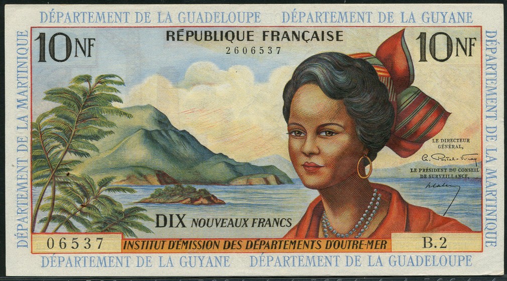 Institut d'Emission des Departements d'Outre-Mer, French Antilles, 10 NF (nouveaux francs) (2), 'Antillaise', ND (1962), serial number B.2 06537/38, red and multicoloured, woman at right, mountain at left, Postel-Vinay and Calvet signatures, blue DEPARTEMENT DE LA MARTINIQUE/GUADELOUPE/GUYANE in borders, reverse multicoloured, cane harvesting and factory