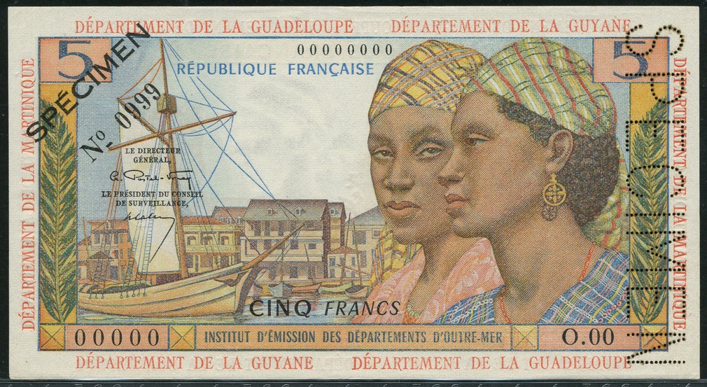 Institut d'Emission des Departements d'Outre-Mer, French Antilles, specimen 5 francs, 'Antillaise', ND (1960-), zero serial numbers, pale blue and multicoloured, two ladies at right, boat and harbour at left, Postel-Vinay and Calvet signatures, red DEPARTEMENT DE LA MARTINIQUE at left and right, DEPARTEMENT DE LA GUADELOUPE and GUYANE above and below, reverse multicoloured, two bullock carts with harvest