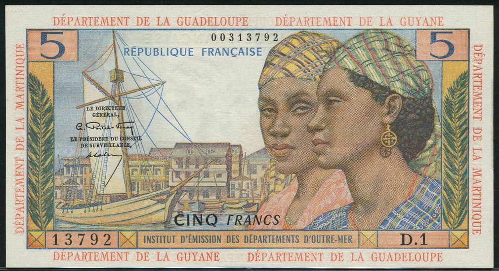 Institut d'Emission des Departements d'Outre-Mer, French Antilles, 5 francs, 'Antillaise', ND (1960-), serial number D.1 13792, pale blue and multicoloured, two ladies at right, boat and harbour at left, Postel-Vinay and Calvet signatures, red DEPARTEMENT DE LA MARTINIQUE at left and right, DEPARTEMENT DE LA GUADELOUPE and GUYANE above and below, reverse multicoloured, two bullock carts with harvest