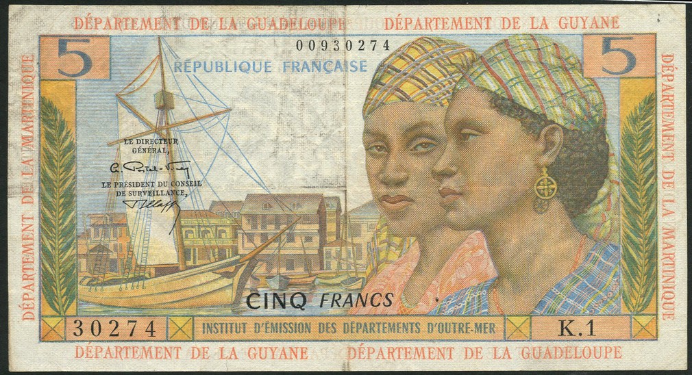 Institut d'Emission des Departements d'Outre-Mer, French Antilles, 5 francs, 'Antillaise', ND (1966-), serial number K.1 30274, pale blue and multicoloured, two ladies at right, boat and harbour at left, Postel-Vinay and Clappier signatures, red DEPARTEMENT DE LA MARTINIQUE at left and right, DEPARTEMENT DE LA GUADELOUPE and GUYANE above and below, reverse multicoloured, two bullock carts with harvest