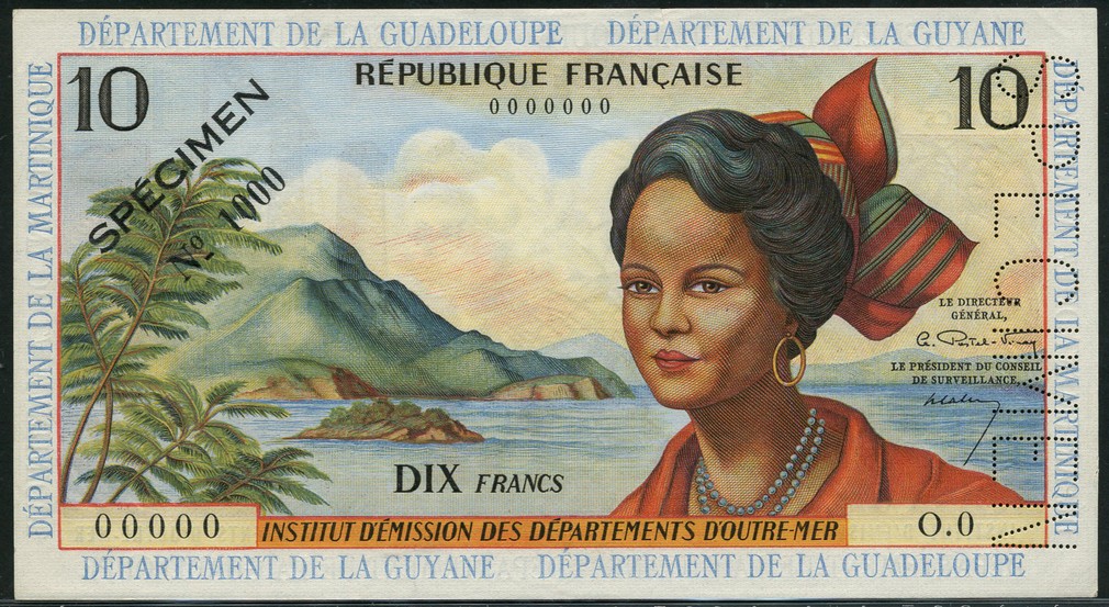 Institut d'Emission des Departements d'Outre-Mer, French Antilles, specimen 10 francs, 'Antillaise', ND (1962), zero serial numbers, red and multicoloured, woman at right, mountain at left, Postel-Vinay and Calvet signatures, blue DEPARTEMENT DE LA MARTINIQUE/GUADELOUPE/GUYANE in borders, reverse multicoloured, cane harvesting and factory