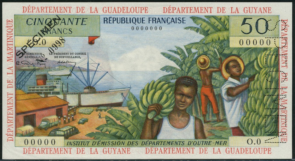 Institut d'Emission des Departements d'Outre-Mer, French Antilles, specimen 50NF (nouveaux francs), ND (1962), zero serial numbers, blue and multicoloured, banana harvesting and dock loading in field, Postel-Vinay and Calvet signatures, red DEPARTEMENT DE LA MARTINIQUE/GUADELOUPE/GUYANE in borders, reverse multicoloured, allegorical couple and coastline in field