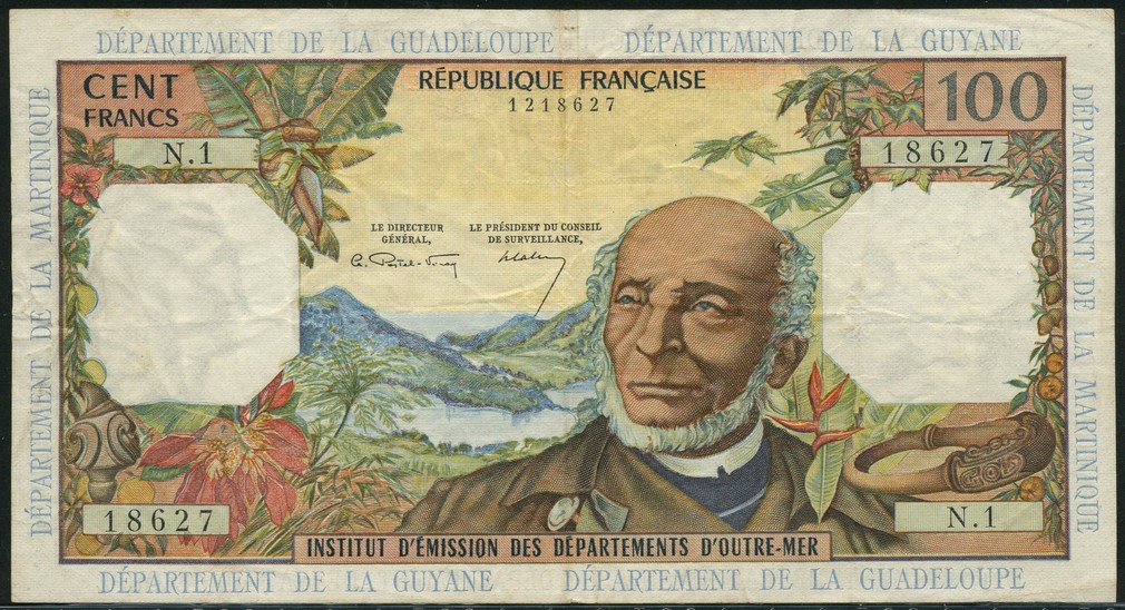 Institut d'Emission des Departements d'Outre-Mer, French Antilles, 100 francs, 'Schoelcher', ND (1962), serial number N.1 18672, blue and multicoloured, Victor Schoelcher at right, landscape in background, banana harvesting and dock loading in field, Postel-Vinay and Calvet signatures, blue DEPARTEMENT DE LA MARTINIQUE/GUADELOUPE/GUYANE in borders, reverse multicoloured, Victor Schoelcher and allegorical scenes and arms