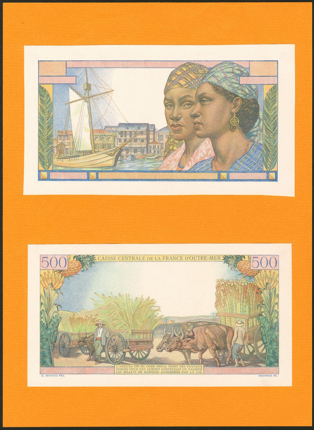 Caisse Centrale de la France d'Outre-Mer, for Guadeloupe, Guyane, Martinique, Reunion, Saint Pierre et Miquelon, French Equatorial Africa, a partial proof/essay for an obverse and reverse 500 francs, type of 1946, blue and multicoloured, vignette at left of a view of Pointe a Pitre, at right two women representing Martinique and Guadeloupe, reverse multicoloured, carts and bullocks