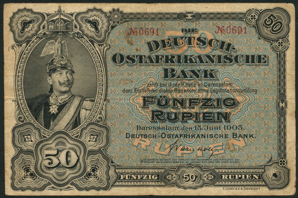 German East Africa, 50 rupien, 15 June 1905, serial number 0691, black, pale blue and orange, Kaiser Wilhelm II at left, value in field, reverse pink, pale blue-green, no serial numbers on reverse