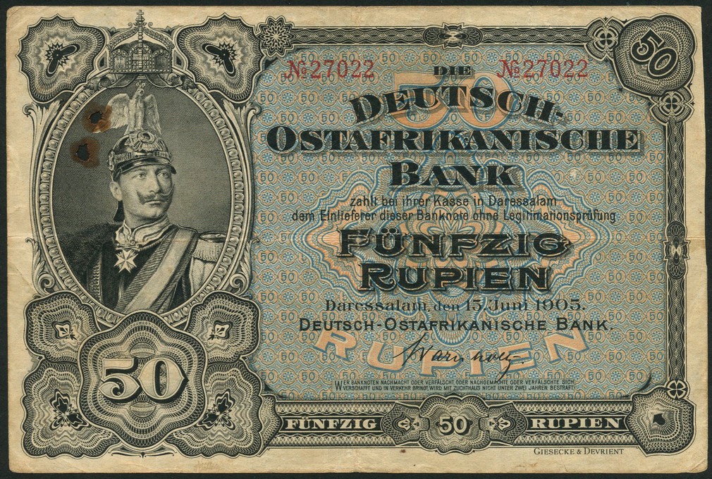 German East Africa, 50 rupien, 15 June 1905, serial number 0691, black, pale blue and orange, Kaiser Wilhelm II at left, value in field, reverse pink, pale blue-green, two serial numbers on reverse