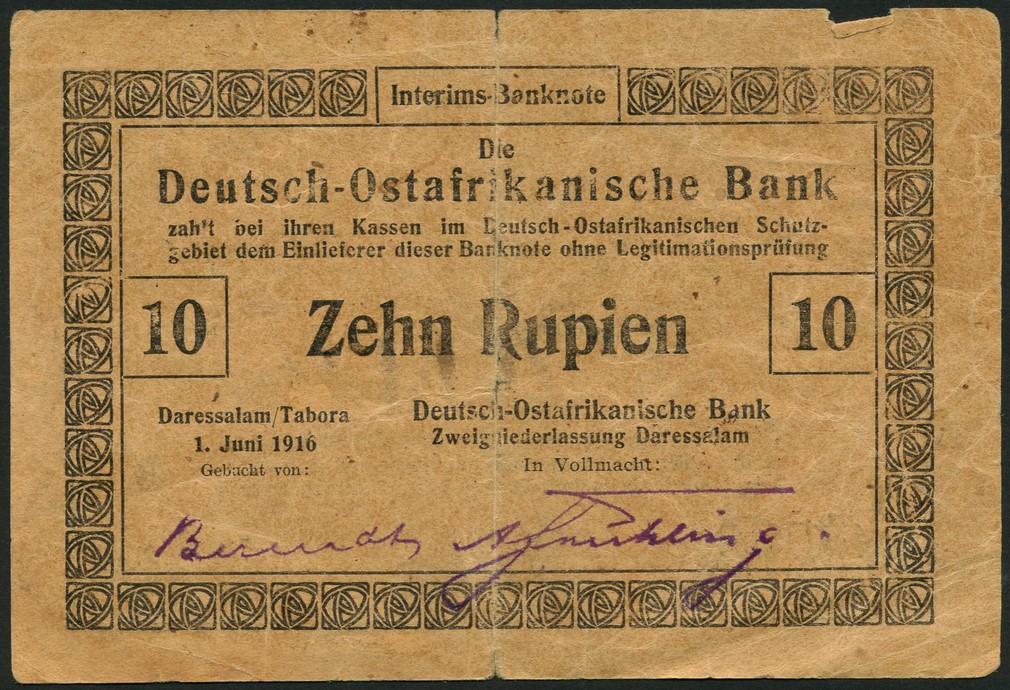 (x) German East Africa, a group comprising 1 rupie (2), blue and 1 rupie (32), black text on white, November 1915/1916, 1 rupie December 1915, 5 rupien (2), November 1915 and 5 rupien, February 1916, blue and 10 rupien, June 1916, 1 rupie (2), July 1917