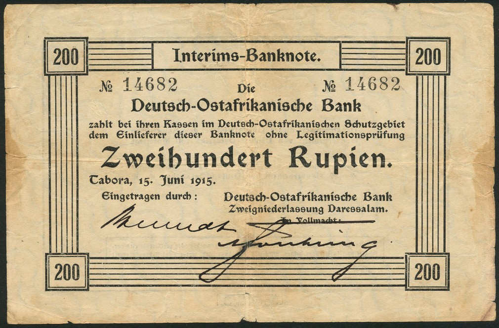German East Africa, emergency World War 1 issues, 200 rupien, 15 June 1915, serial number 14682, black printing on cream watermarked paper, value at each corner