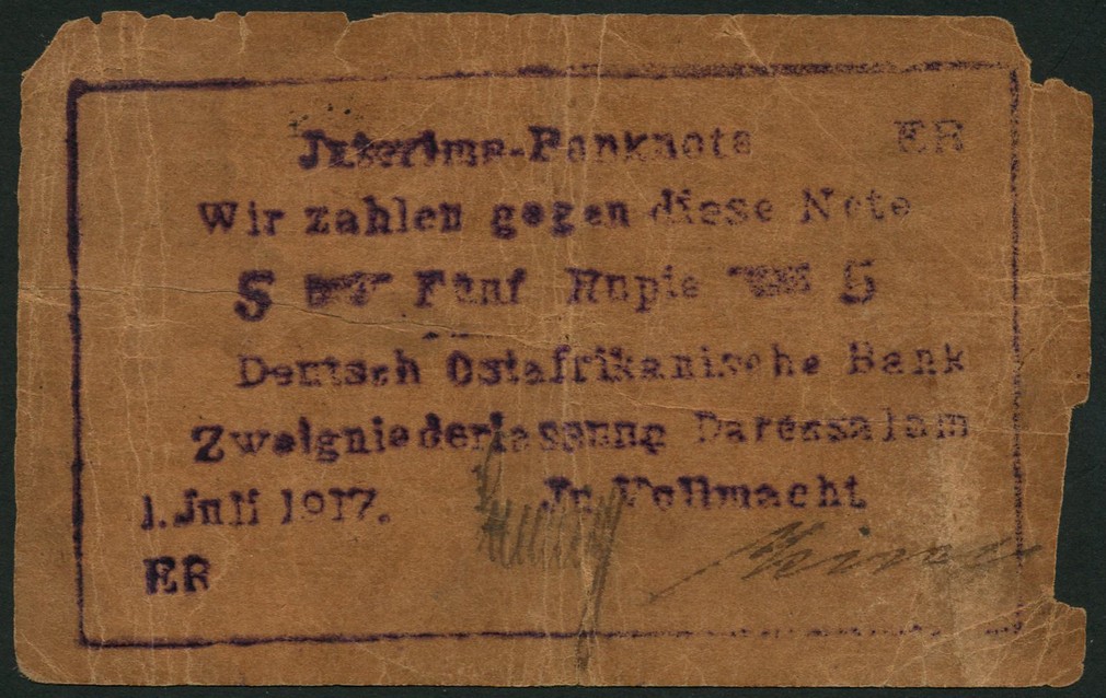 German East Africa, emergency World War I issues, a group of 'bush notes' comprising 1 rupie (2), 5 rupien and 10 rupien, all 1 July 1917, first two black printing on thin white card, others blue printing on tan card, all with two manuscript signatures, eagle on reverse