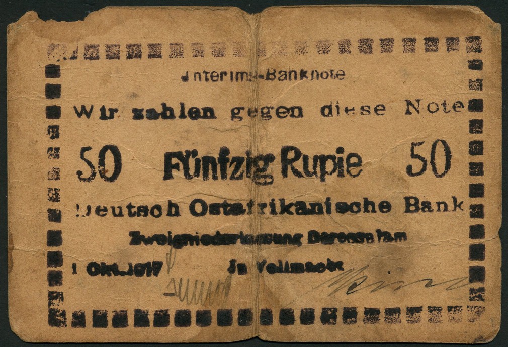German East Africa, emergency World War 1 issues, 50 rupien 'bush note', 1 October 1917, serial number 55046, black printing on tan card, black squares as border, two manuscript signatures at low centre
