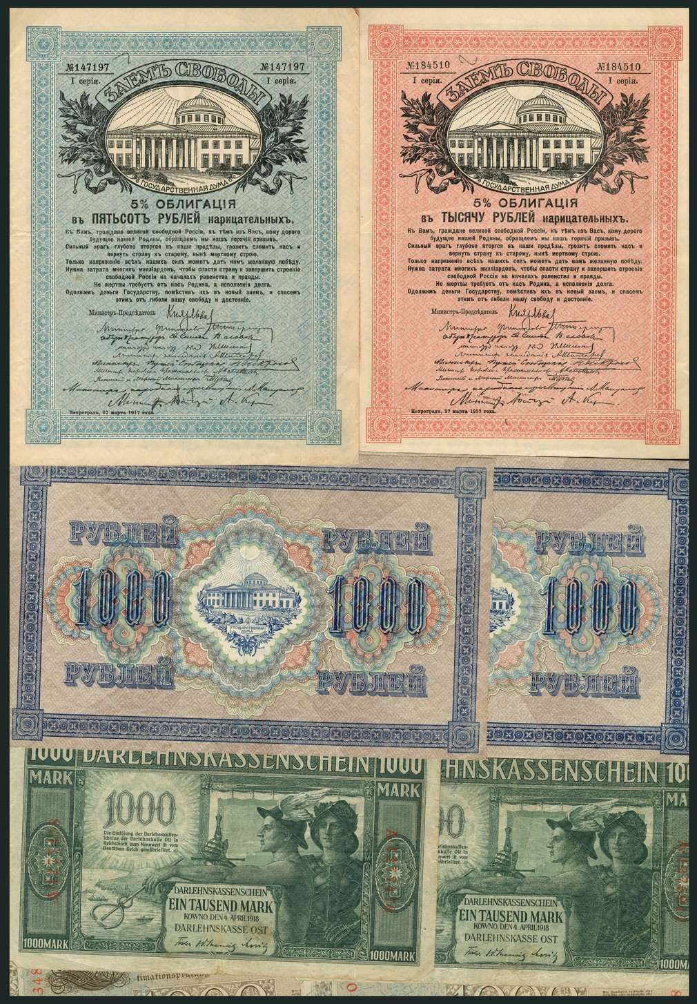 Darlehnskassenschein, 1000 marks (44), 4 April 1918, green, Mercury and youth in armour at right, mixture of green and black signatures and 6 and 7 digit serial numbers (Pick R134, Rosenberg 471a, b, c), also a sizable group of Russian and German notes of a similar date (91),
