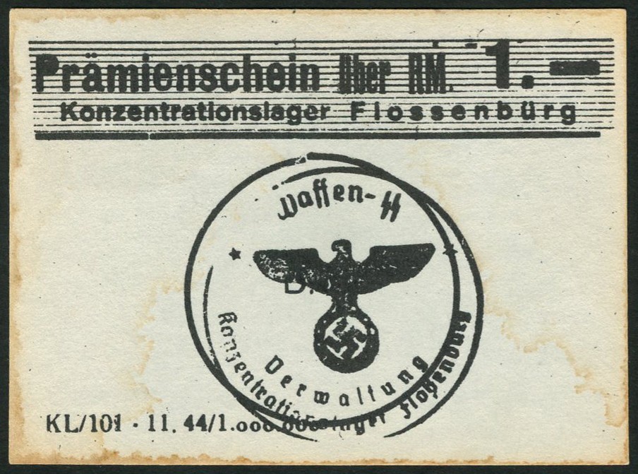 (x) Konzentrationslager Flossenberg, Germany, 1 reichsmark, 1944, black text on pale blue card, a circular Waffen SS handstamp at centre