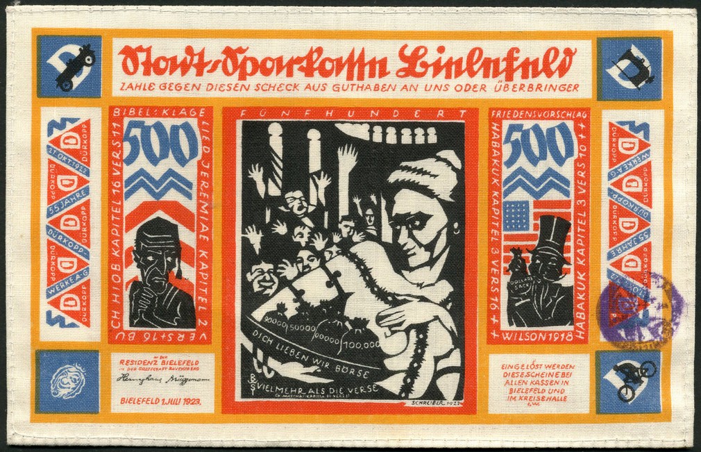 Stadt-Sparkasse Bielefeld, a selection of silk notes comprising 25 mark (5), July 1921 (4) and April 1922, 50 mark, April 1922, 500 mark, July 1923 and 5000 mark, February 1923, and 1 goldmark, December 1923