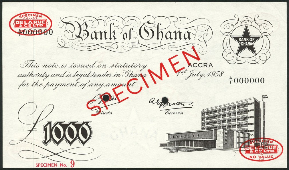 (†) Bank of Ghana, specimen colour trial £1000, 1 July 1958, serial number A/1 000000, black, Ghana star in circle at upper right, Bank of Ghana building in Accra at lower right, value at lower left, reverse value set in ornate patterns, overprinted SPECIMEN in red with two specimen De La Rue ovals on obverse and reverse, two punch holes
