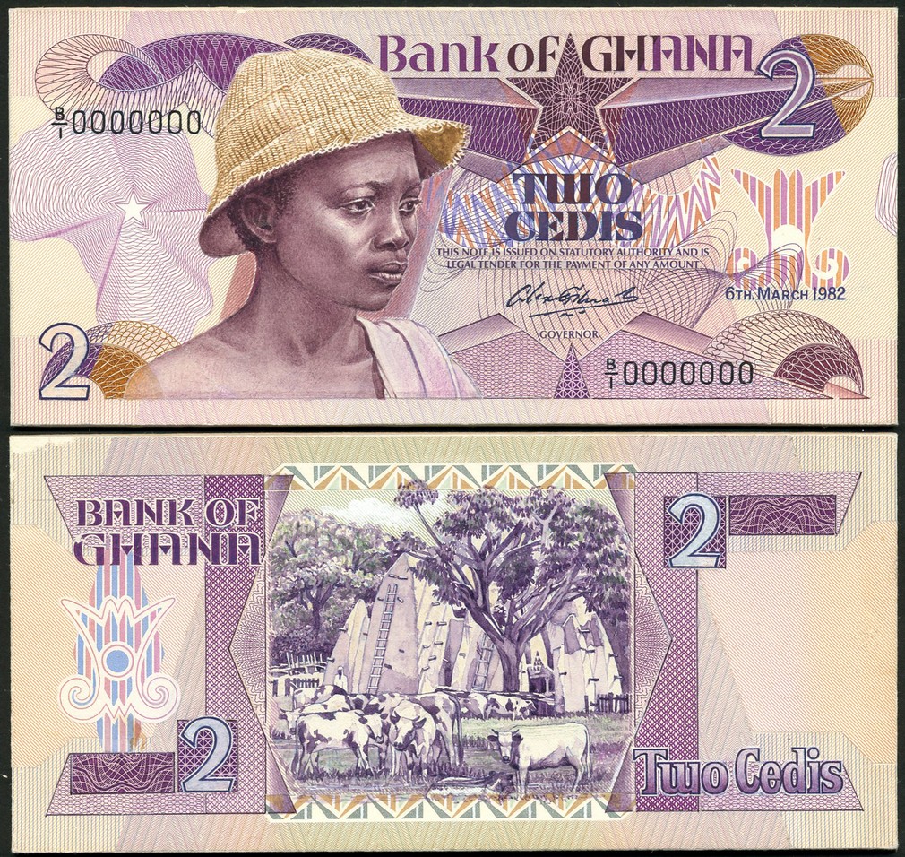 (†) Bank of Ghana, an obverse and reverse composite essay on card for a 2 Cedis, 6 March 1982, serial number B/1 00000000, violet, brown and multicoloured, boy wearing woollen hat at left, Ghana star at top centre, value at upper right and lower left, reverse vignette of Asante traditional houses, trees and cattle