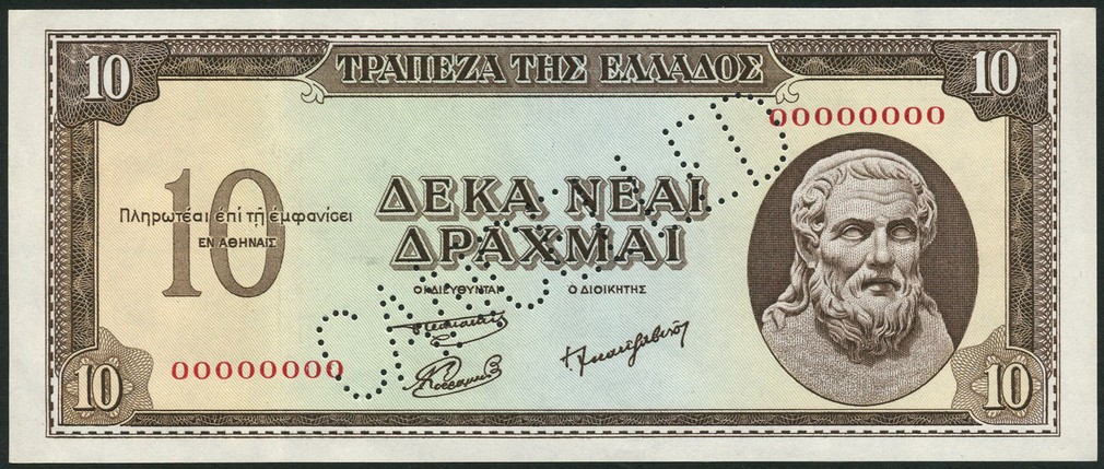 (†) Bank of Greece, a specimen 1 drachma, ND (c 1954), red zero serial numbers, blue and pale orange, head of Athena at right, reverse blue and pale pink and orange, value at centre, left and right, also 5 drachmai, orange-brown, maiden at right and 10 drachmai, brown, Hesiod at right