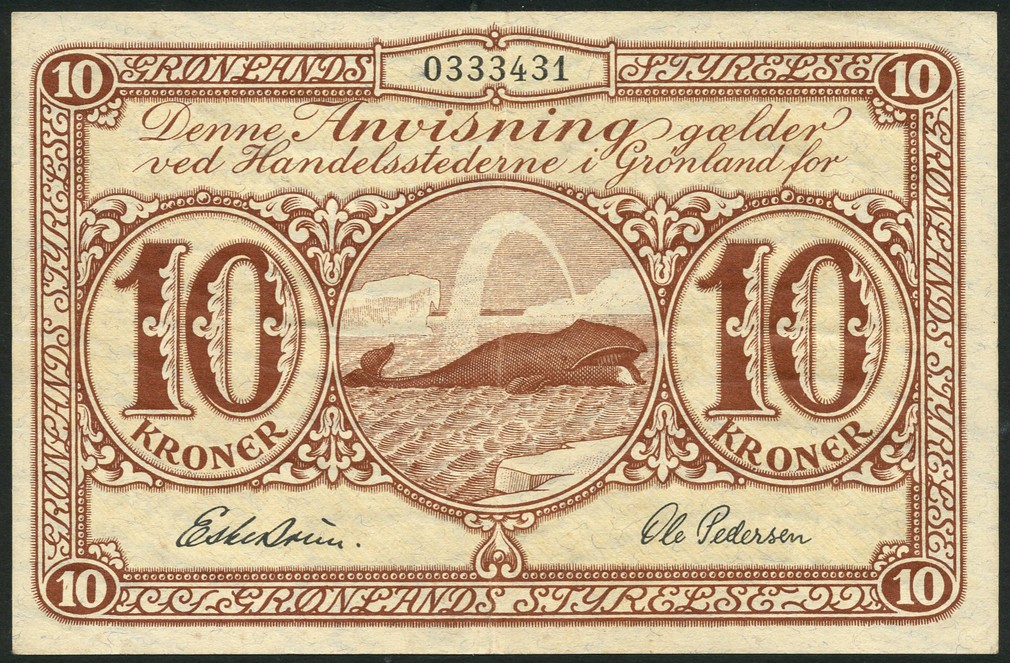 (x) Greenland, State Notes, 10 Kroner, ND (1945-52), serial number 0333431, brown on yellow underprint, hump-back whale at centre flanked by values