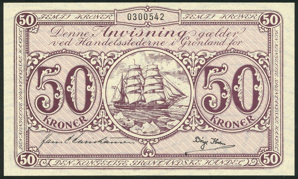 (x) Greenland, State Notes, 50 Kroner, ND (1953-67), serial number 0300542, purple on lilac underprint, sailing ship at centre flanked by values, reverse map of Greenland, polar bear and arms at centre