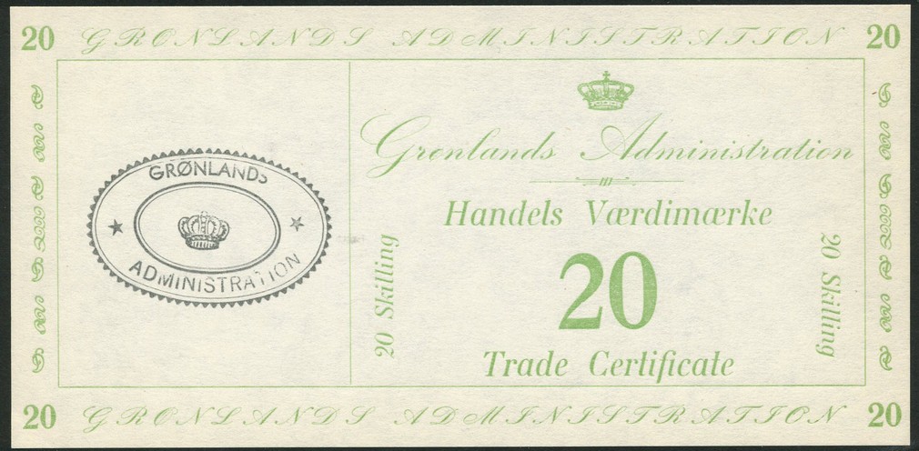(x) Greenland, Trade Certificates 1, 5, 20 skilling, 1942, crown at top right, value at low right and each corner, black oval handstamp at left,