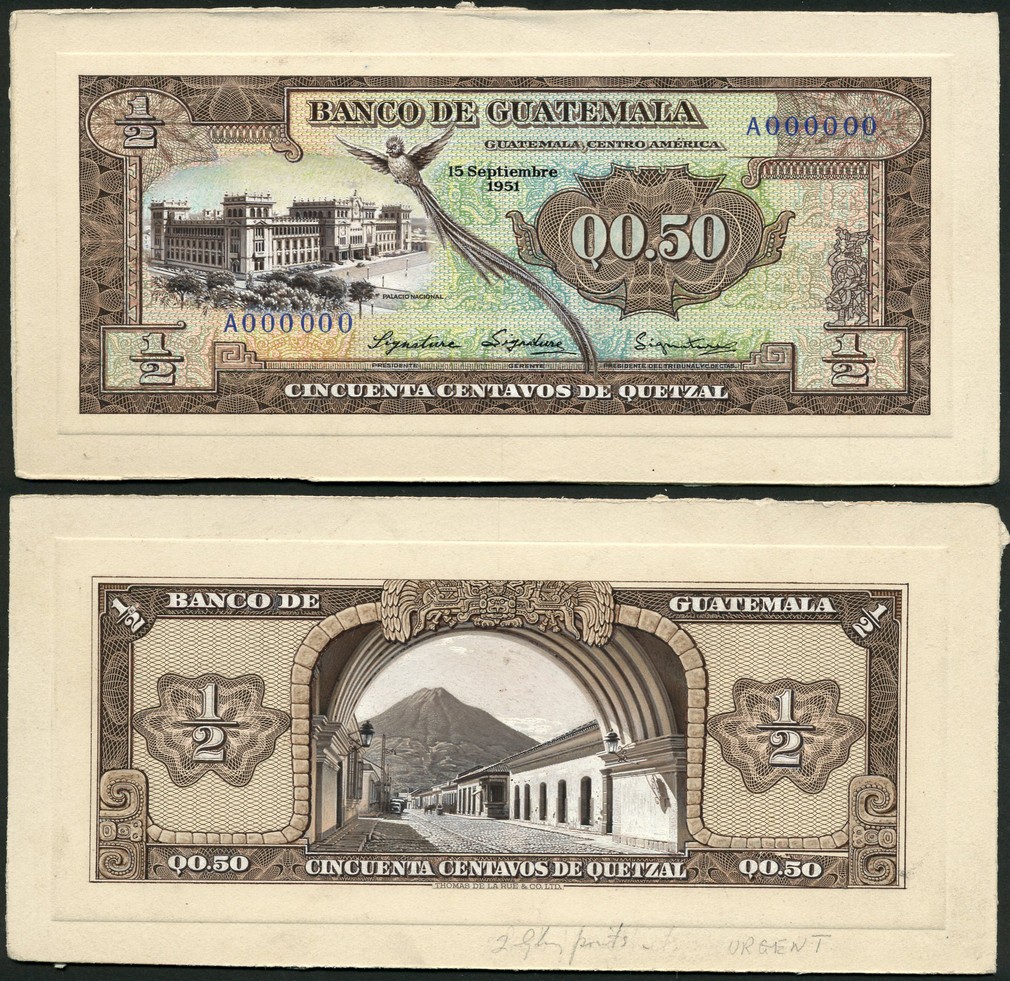 (†) Banco de Guatemala, an obverse and reverse composite essay on board for a 0.50 Quetzal, 15 September 1951, serial number A 0000000, brown on green, blue and orange underprint, National Palace at left, quetzal in flight at centre, value in guilloche at centre right, reverse archway, cobbled street and volcano, value in guilloches at left and right