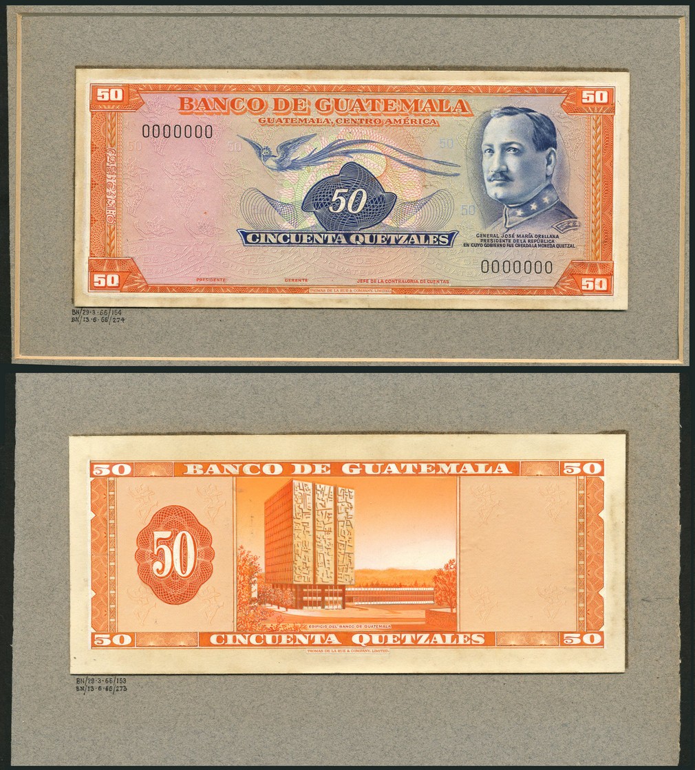 (†) Banco de Guatemala, an obverse and reverse composite essay on board for a 50 Quetzales, ND (1966), serial number 00000000, orange and blue on multicoloured underprint, General Jose Maria Orellana at right, quetzal in flight at upper centre, value in each corner, reverse Bank of Guatemala building