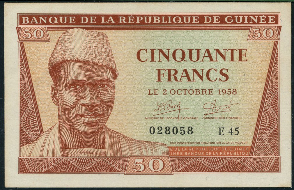 (x) Banque de la Republique de Guinee, 50 francs, 2 October 1958, prefix E45, brown, president Sekou Toure at left