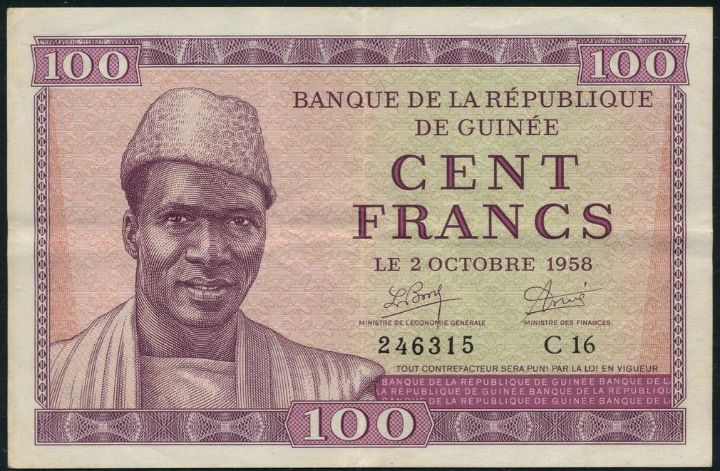 (x) Banque de la Republique de Guinee, 100 francs, 2 October 1958, prefix C16, lilac, president Sekou Toure at left