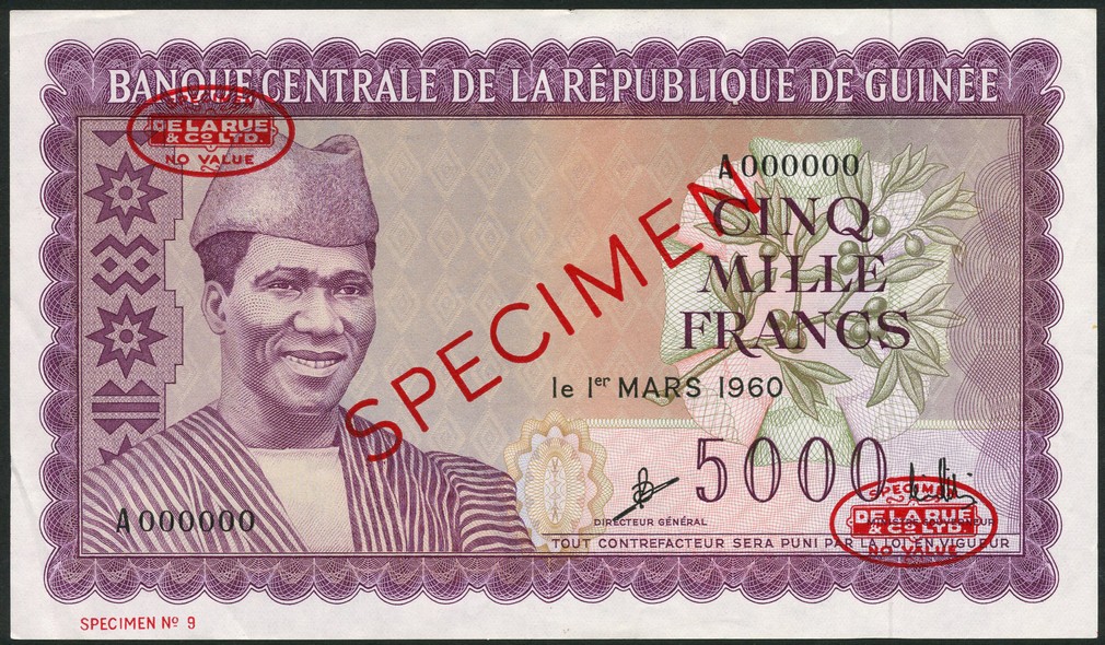 (†) Banque Centrale de la Republique de Guinee, a specimen set of the 1 March 1960 series, all serial number A 000000, all President Ahmed Sekou Toure at left