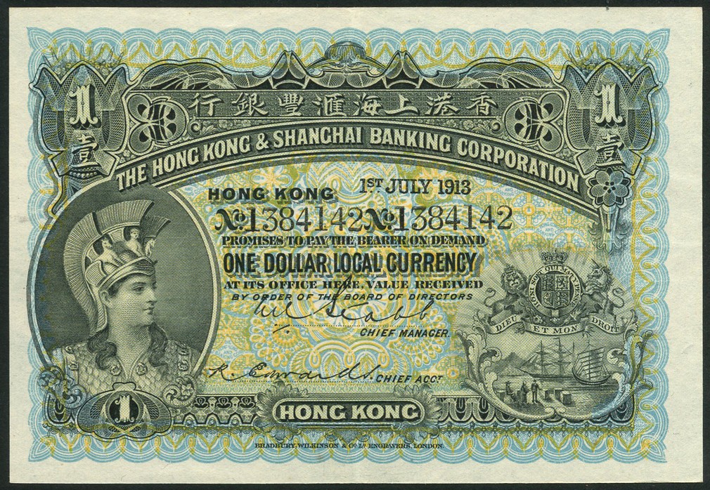 (x) Hong Kong & Shanghai Banking Corporation, $1, 1 July 1913, serial number 1384142, blue and orange, helmeted head of Minerva at left, arms at low right, Stabb signature at centre, reverse red, maiden with lyre at centre