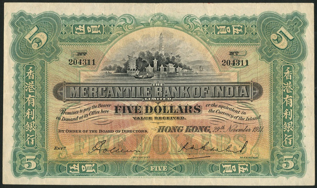 (x) Mercantile Bank of India, Hong Kong, $5, 29 November 1941, serial number 204311, green and pale red and yellow, pagoda on an island top centre, value at centre in sunburst pattern, value at each corner, two printed signatures below, reverse red, head of Mercury at centre, value at left and right