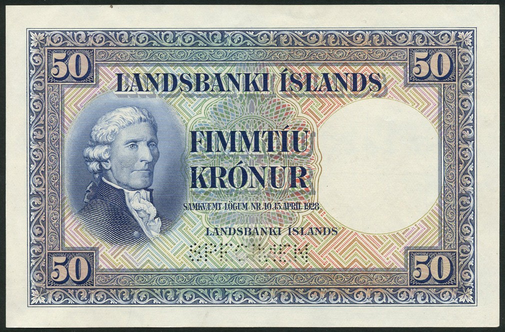 (†) Landsbanki Islands, Iceland, uniface proof 50 kronur, law of 1928, no serial numbers, blue, orange and green, J. Eriksson at left, value at centre and at each corner, also specimen 50 kronur, law of 1928, serial number 000001-100000, violet and multicoloured, Eriksson at left, Arnason and Sigurthsson signatures (1917-1945), reverse Icelandic landscape at right, value at each corner, also a colour trial in purple-brown and multicoloured