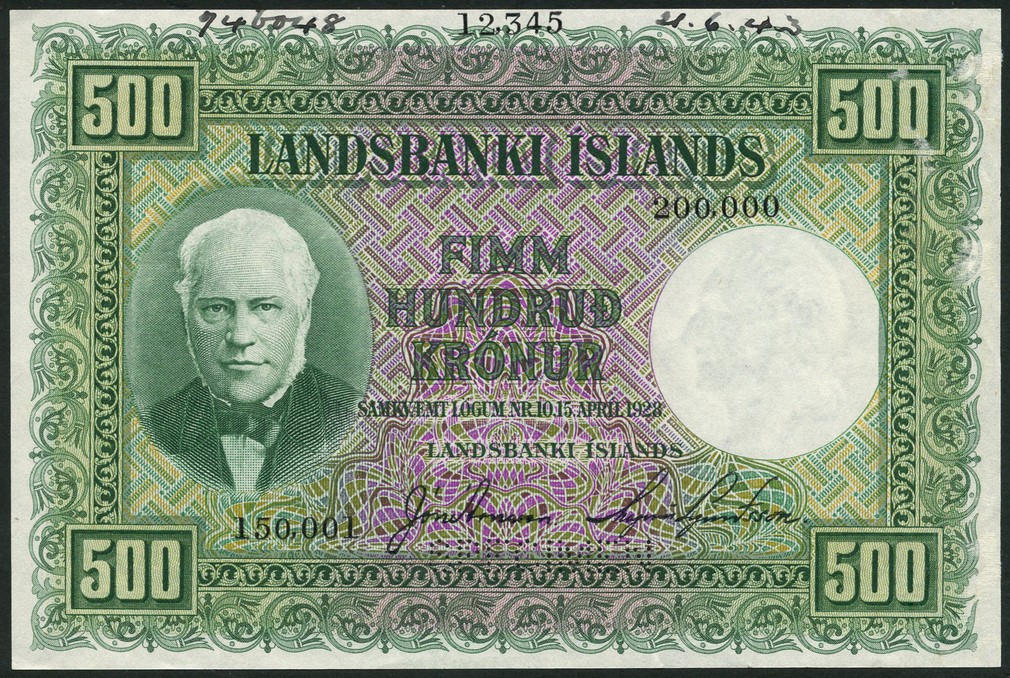 (†) Landsbanki Islands, Iceland, specimen 500 kronur, 15 April 1928 (1943), serial number 150001-200000, green on purple, green and brown underprint, J. Sigurthsson at left, value at each corner, signatures of Arnason and Sigurthsson, reverse green, Icelandic landscape at right, value at each corner,