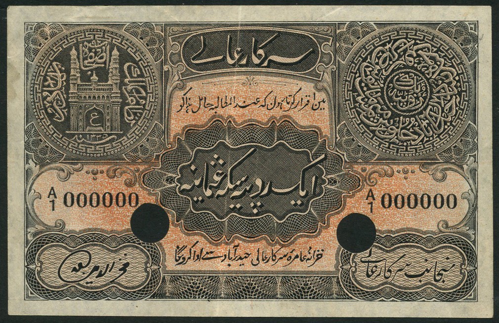 Hydrabad, Government issue, specimen 1 rupee, ND (1919), serial number A1 000000, black on peach underprint, reverse, brown, Waterlow & Sons imprint only on lower margin on reverse, hole punched