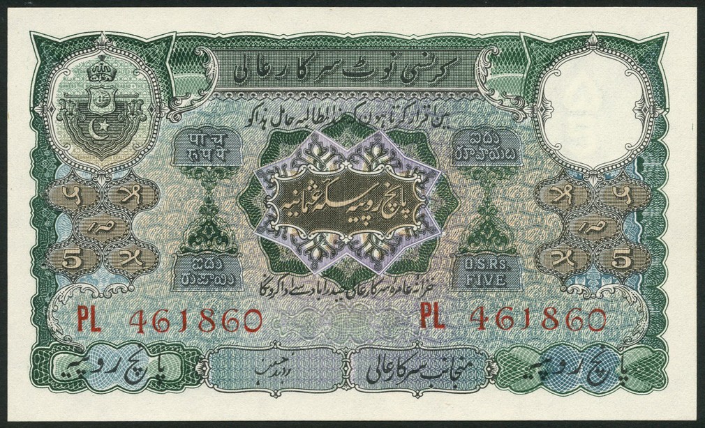 (x) Hyderabad, Government issue, 5 rupees, ND (1945-6), serial number PL 461860, green, tan, purple and blue, arms at top left, value in 5 languages at left and right, reverse five 1 rupee coins at centre, Husain signature
