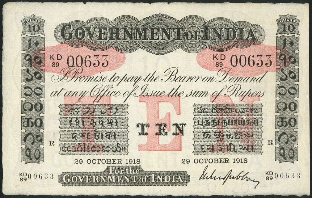 (x) Government of India, Burma Issue, 10 rupees, Rangoon, 29 October 1918, serial number KD/89 00633, black on red underprint, value in nine languages at left and right, Gubbay signature