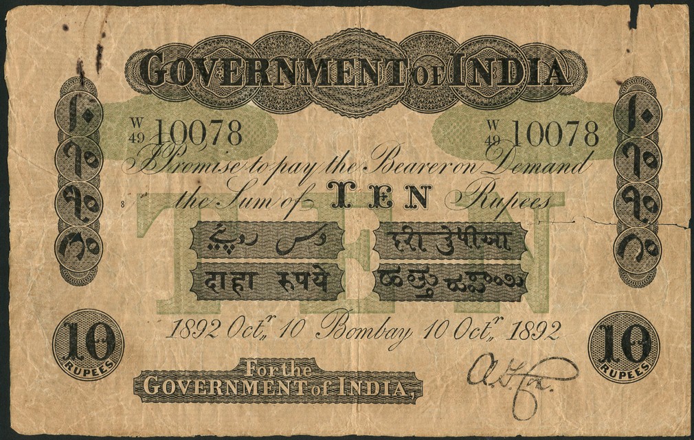 Government of India, 10 rupees, Bombay, 10 October 1892, serial number W/49 10078, black on green underprint, value in five languages at left and right, Cox signature