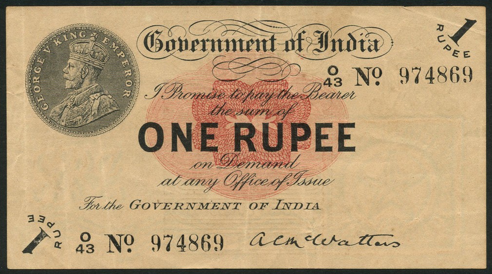 Government of India, 1 rupee, ND (1917), 43 974869, black on red underprint, coin portrait King George top left, value low left, top right and centre