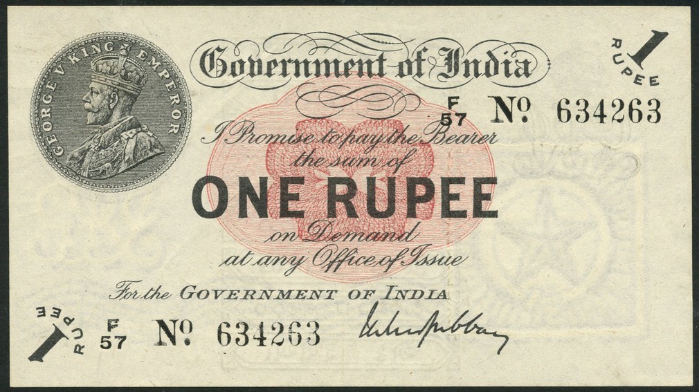 (x) Government of India, 1 rupee, ND (1917-1930), prefix F/57, black and white, George V 1 rupee top left, pale pink central guilloche, Gubbay signature