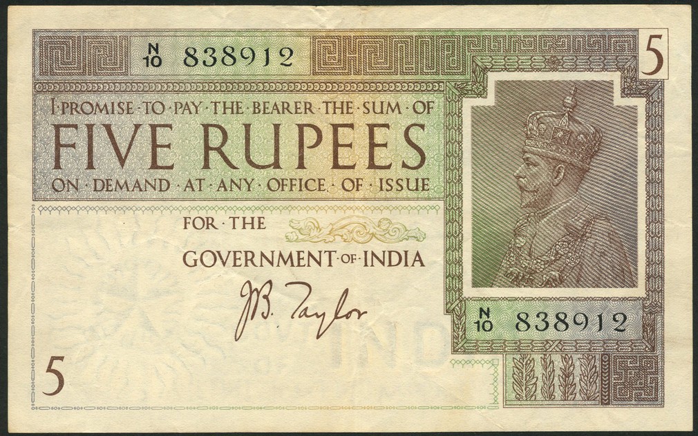 Government of India, 5 rupees (2), ND, serial numbers L28 227545 and N10 838912, brownish violet, green and light brown, portrait King George V at right, value centre left, low left and top right, Denning and Taylor signatures respectively