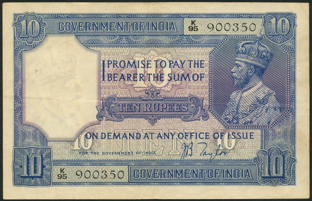 Government of India, 10 rupees (2), ND, serial numbers H46 946485 and K95 900350, dark blue on multicolour underprint, portrait King George V at right, value in each corner and at low centre, Denning and Taylor signatures respectively, reverse, blue, ornate border
