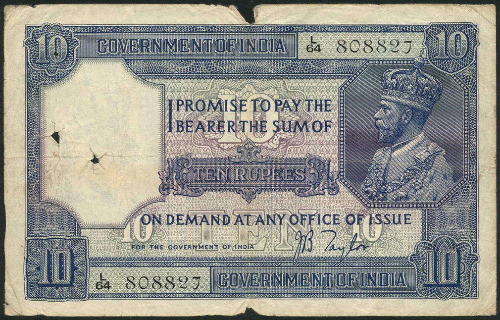 (x) Government of India, a miscellaneous selection of issues comprising George V, 5 rupees, Kelly and 10 rupees, Taylor, George VI, 1 rupee (2), 1 rupee 'Burma', 5 rupees (3), 10 rupees (4) and 10 rupees (5), (facing portrait)