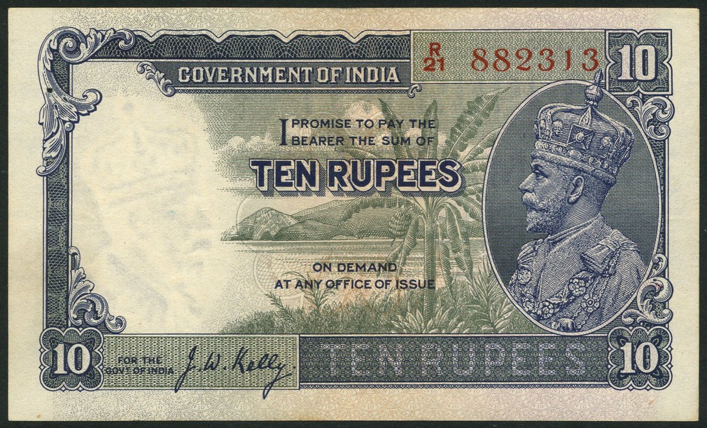(x) Government of India, 10 rupees, ND, serial number R21 882313, Reserve Bank, 10 rupees, ND (1937), serial number D16 779432, portrait of King George V and King George VI at left respectively, both palm tree centre right, mountains in background, reverse, blue, green and pink, elephants and handlers at centre, also 1 rupee, ND (1940), blue-grey, portrait King George VI at right