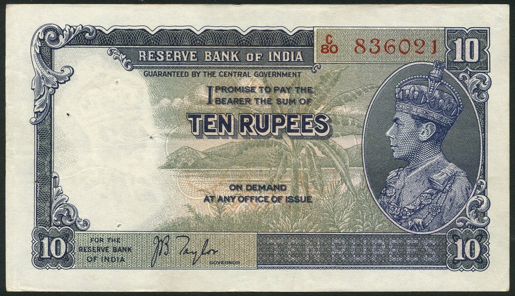 (x) Reserve Bank of India, 10 rupees, ND (1937), red prefix C/80, blue and green, George VI at right, Taylor signature
