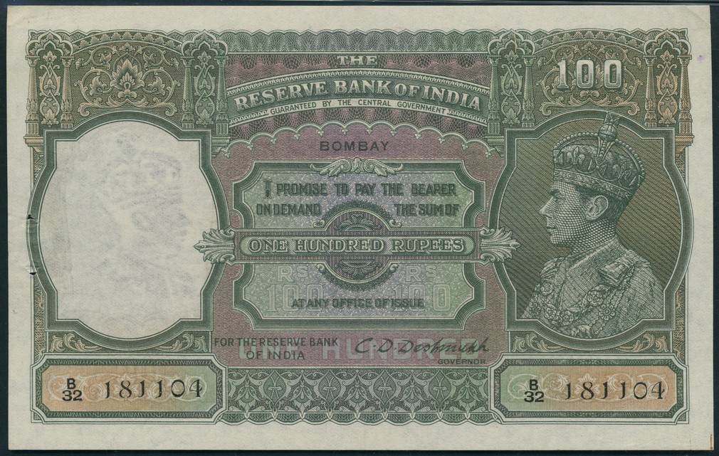 (x) Reserve Bank of India, 100 rupees (2), Bombay, ND (1943), consecutive serial numbers B/32 181104-105, green on multicolour underprint, George VI at right, value at top right, reverse, green, tiger at centre
