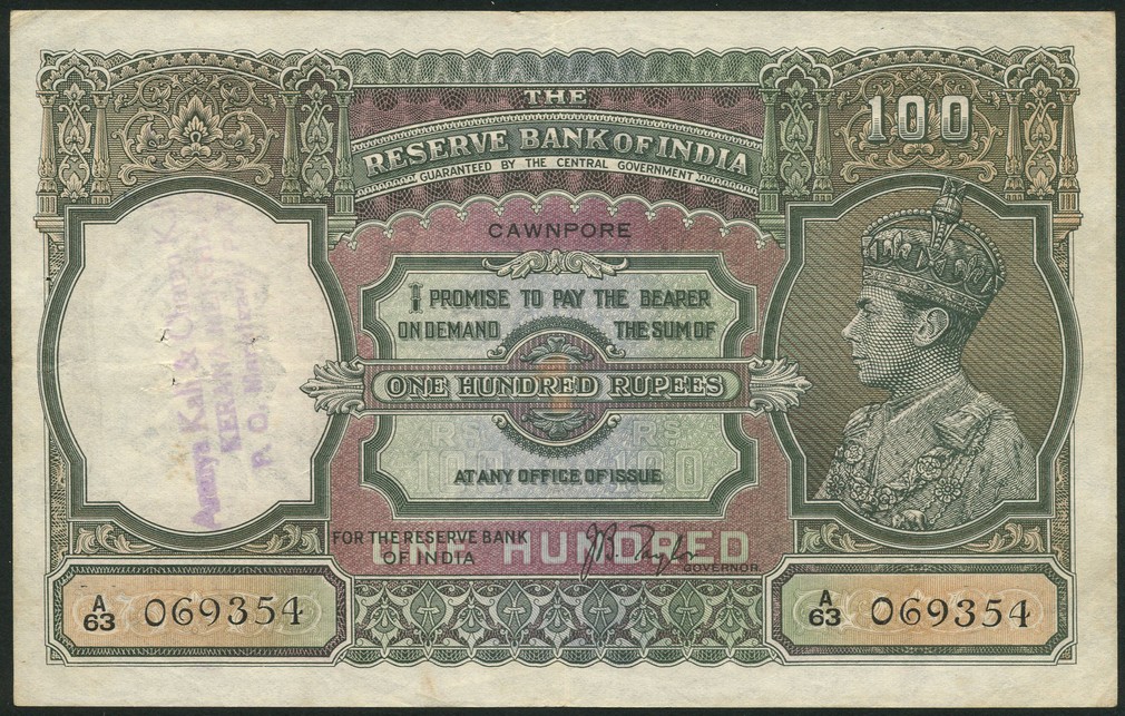 (x) Reserve Bank of India, 100 rupees, ND (1937), Cawnpore, serial number A/63 069354, green and lilac, George VI at right, value at centre and top right, Taylor signature