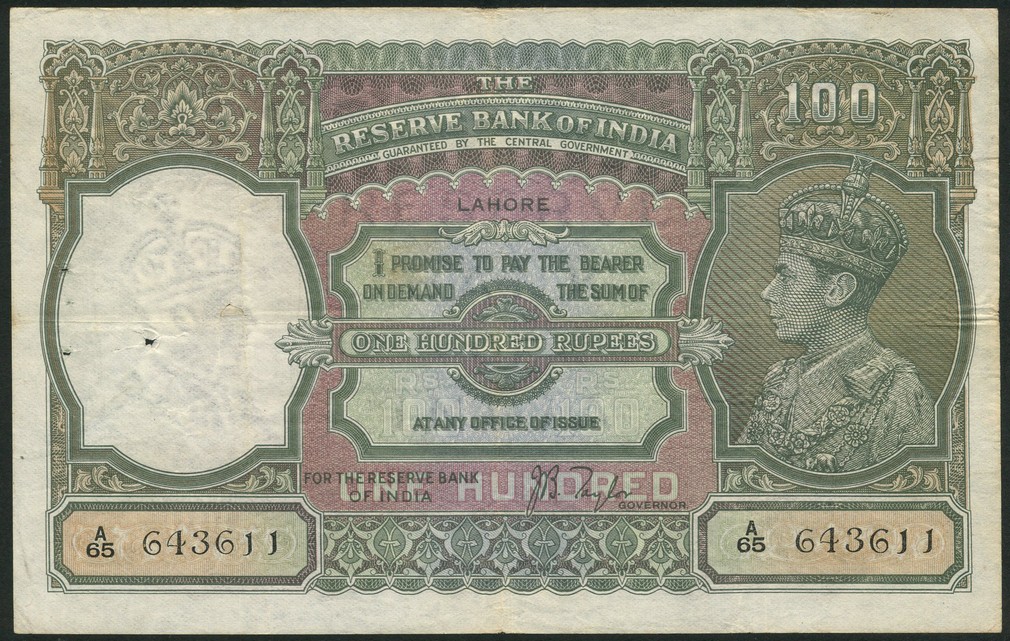 (x) Reserve Bank of India, 100 rupees, ND (1937), Lahore, serial number A/65 643611, green and lilac, George VI at right, value at centre and top right, Taylor signature