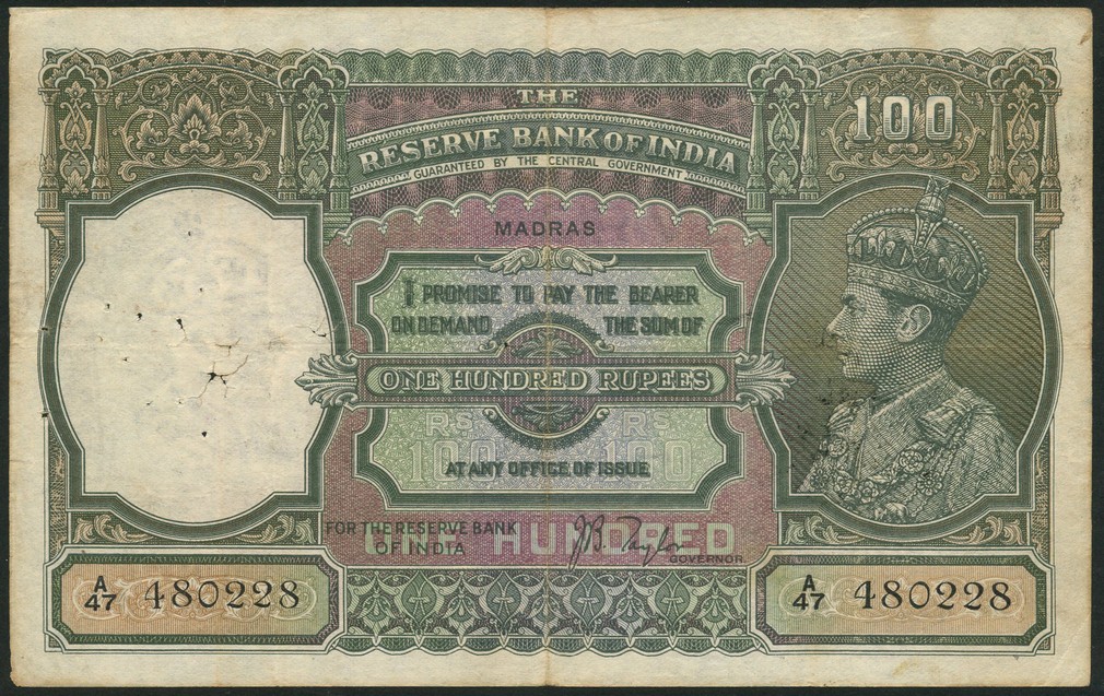 (x) Reserve Bank of India, 100 rupees, ND (1937), Madras, serial number A/47 480228, green and lilac, George VI at right, value at top right, Taylor signature, reverse tiger at centre