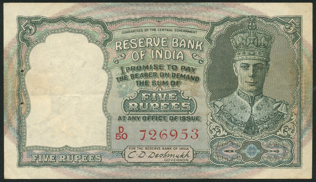 Government of India, 5 rupees, ND (1947), red serial number D/50 726953, green on multicoloured underprint, George VI facing at right